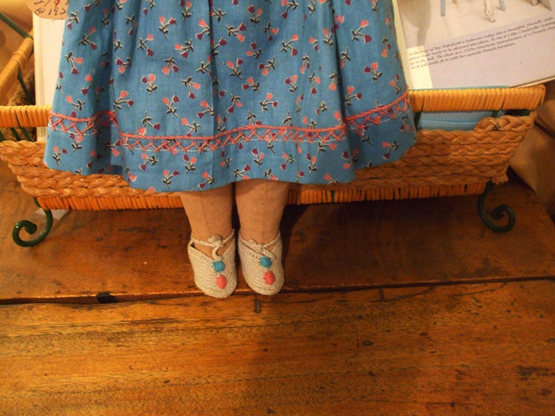 The doll is dressed in a non period home made outfit (not authentic to the doll) and is wearing a pair of crocheted slippers (that look authentic but not sure).