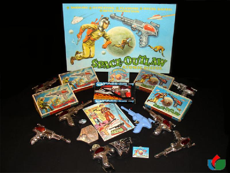 LIMITED EDITION HAND SCREENED PICTURE OF A ATOMIC PISTOL THE CANVAS HAS ON THE TOP SMOKING ***REPEATING *** FLASHING*** RECORD BARREL THEN SPACE OUTLAW - ATOMIC PISTOL ON THE PISTOL SPACE OUTLAW IS WRITTEN THERE WERE LIMITED TO ONLY 50 EACH OF WHICH 1/2 STAYED OVERSEAS ESPECIALLY IN JAPAN THIS CANVAS WAS DONE BY J. & L. KENDALL LTD. ENGLAND IN MCMLII