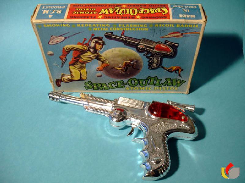 Space Outlaw Ray Gun is approx. 10"L and was made in England in the 60's by B.C.M. Co. Gun has great action, barrel reciprocates and caps create flashes behind the red plastic windows when trigger is pulled. Also, the dials on both sides of the gun turn. One to adjust the range and the other to choose between Gamma, Cosmic, and Sonic rays. Gun is Chrome plated heavy die cast metal. Very highly detailed with space motifs. Bright chrome finish.
