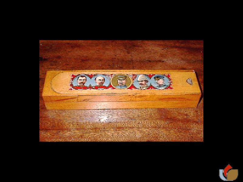 VERY RARE BOER WAR PERIOD (1899 -1902) MOKO WOODEN PENCIL CASE WITH MILITARY LEADERS ON THE SLIDING TOP THEY ARE FROM LEFT TO RIGHT : WARREN, WHITE, BULLER (IN CENTRE GOLD CIRCLE) DUNDONALD AND KELLY-KENNY, THEY ARE FINE QUALITY CHROMOLITHO PRINTED ILLUSTRATIONS AND THE CASE COPYRIGHT WAS ENTERED AT STATIONERS HALL. THE CASE HAS TWO LAYERS WHICH THE TOP SECTION SWIVELS OPEN.